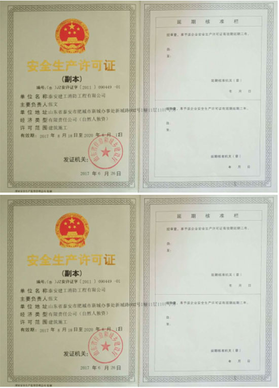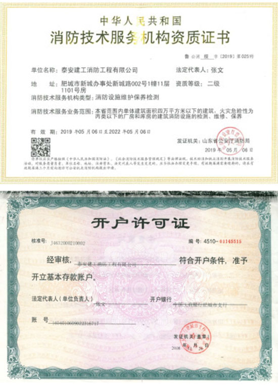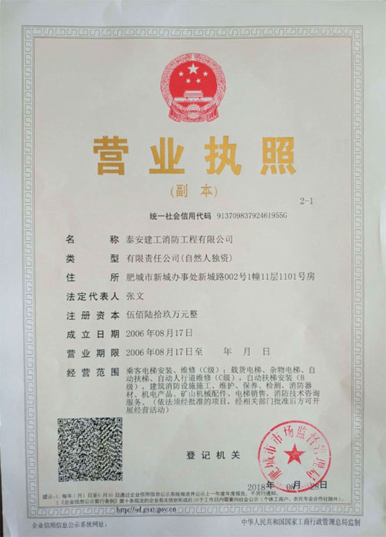 泰安建工消防工程有限公司,注冊成立于 2006 年8 月,注冊資金569 萬元。具有山東省公安廳消防局、山東省建筑工程管理局頒發(fā)的建筑消防設(shè)施貳級施工資質(zhì),2012 年9 月13日取得特種設(shè)備安裝改造許可證(電梯),2019 年5月取得建筑消防設(shè)施維修保養(yǎng)二級資質(zhì)。是山東消防協(xié)會會員單位,2007 年6月被泰安市工商局命名為市級守合同重信用企業(yè)。 公司成立以來,一直奉行“質(zhì)量第一,用戶至上,社會利益為先”的原則。公司在“重工程質(zhì)量,創(chuàng)精品工程”的戰(zhàn)略方針指導(dǎo)下,已完成及目前在建的消防工程近百余項(xiàng)。公司下設(shè)工程部、技術(shù)部、維修部、財(cái)務(wù)部,工程技術(shù)專業(yè)人員 42 人。擁有一級、二級注冊建造師6 人,公司經(jīng)理、技術(shù)負(fù)責(zé)人、財(cái)務(wù)負(fù)責(zé)人均具有高級專業(yè)職稱,所有技術(shù)人員均經(jīng)省消防局或省建管局專業(yè)培訓(xùn)并持證上崗。主要從事建筑消防設(shè)施施工、維護(hù)、保養(yǎng)、檢測;乘客電梯、載貨電梯、雜物電梯、自動扶梯、安裝、維修;消防器材、機(jī)電產(chǎn)品、礦山機(jī)械配件、電梯銷售;消防技術(shù)咨詢服務(wù)。